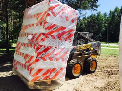Palečių iškrovimas su bobcat arba ekskavatoriu krautuvu.