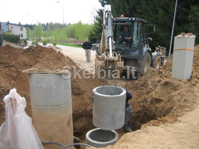 Kanalizacijos žiedų montavimas su ekskavatoriais krautuvais;