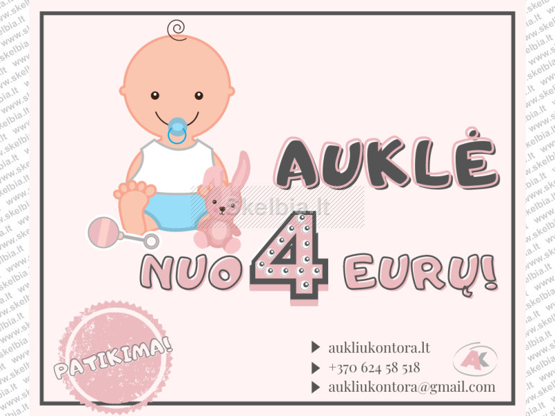 aukliukontora.lt – greita, patogi ir išskirtinė vieta rasti tinkamą auklę Jūsų vaikui. Tėveliai turi galimybę surasti žmogų, teikiantį skubaus iškvietimo, naktinės, ilgalaikės auklės ir valandinės auklės paslaugas Vilniuje. Auklių kontoros išskirtinumas – itin greitas auklės suradimas (per 6 val. - 24 val). Jūs pateikiate užklausą kokios ieškote auklės, o mes pasiūlome Jums geriausiai tinkantį variantą. Internetiniame puslapyje taip pat pateikiamos auklių patirtys, kurios padės iš anksto susipažinti su aukle. Jūsų patogumui – siūloma galimybė gauti informaciją bei nuotraukas tuo metu, kol vyksta vaiko priežiūra.