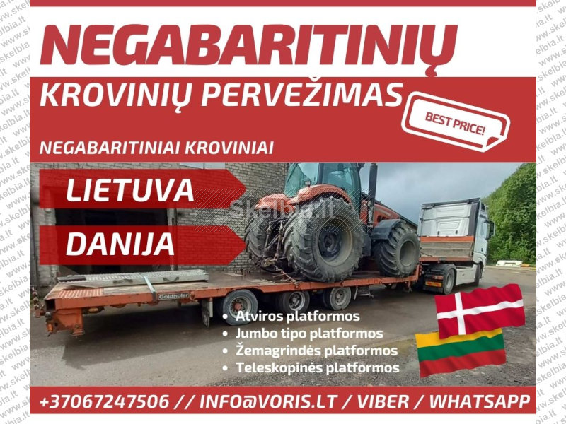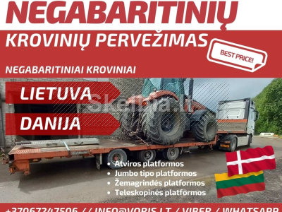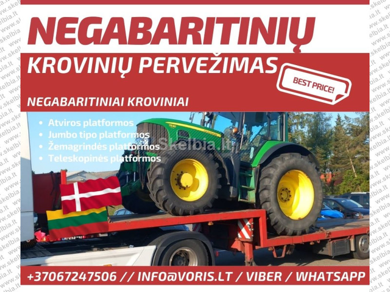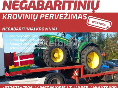 ( Kombainų pervežimas, vikšriniu ekskavatoriu pervezimas, ratiniu ekskavatoriu pervezimas, Ilgastrėliu ekskavatoriu pervezimas, buldozeriu pervezimas, savivarčiu pervezimas, frontaliniu krautuvų pervežimas, volu pervežimas, frezu pervežimas, statybiniu vagonėliu pervežimas, metalo konstrukciju pervezimas, šieno pervezimas, žemės ūkio technikos pervežimas, statybinėa technikos pervežimas, Kelių tiesimo technikos pervežimas, specialios technikos pervežimas.)